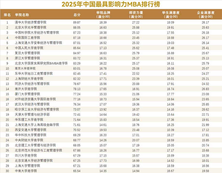 2025年“中国最具影响力MBA”的调查目的,是为了深度解读世界著名MBA最新的发展动向及中国本土MBA在职业经理人、企业、学生心目中的影响力,并为其提供有效和客观信息导向。主办方在榜单制作过程中坚持市场营销及客户为重的理念,着重针对客户对“商品/商家”满意度的品牌营销理念作为重要考评依据,以学院品牌、社会影响力、师资水平、学生满意度、企业满意度、生源质量、教学效果等多项指标为考核。其中,企业对MBA人才的满意度以及学员对MBA教育机构的满意度,占据了测评指标的较大权重。 查看详情>>